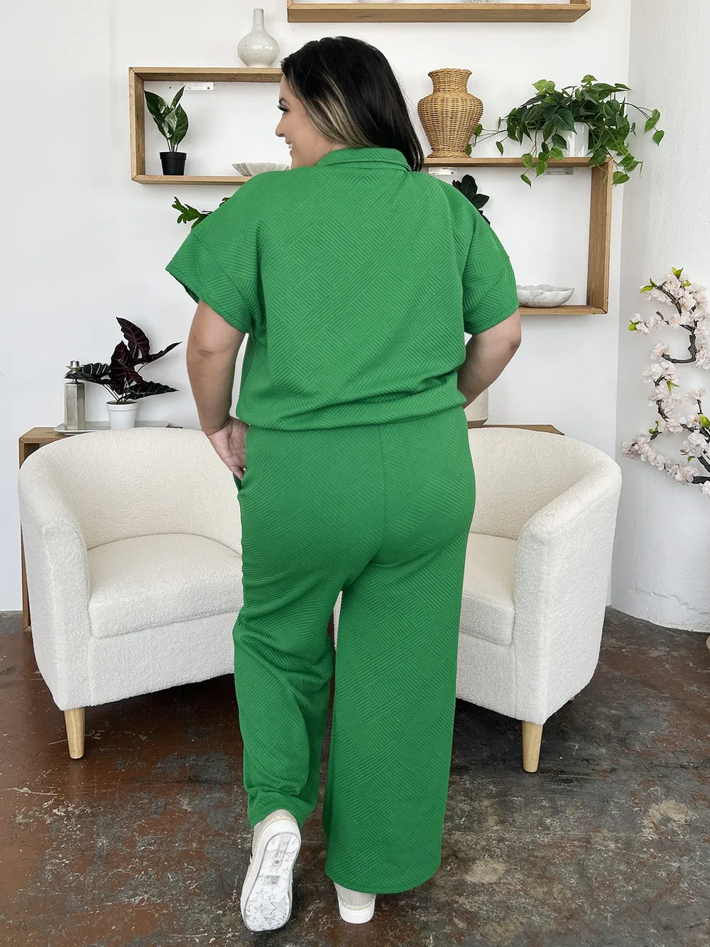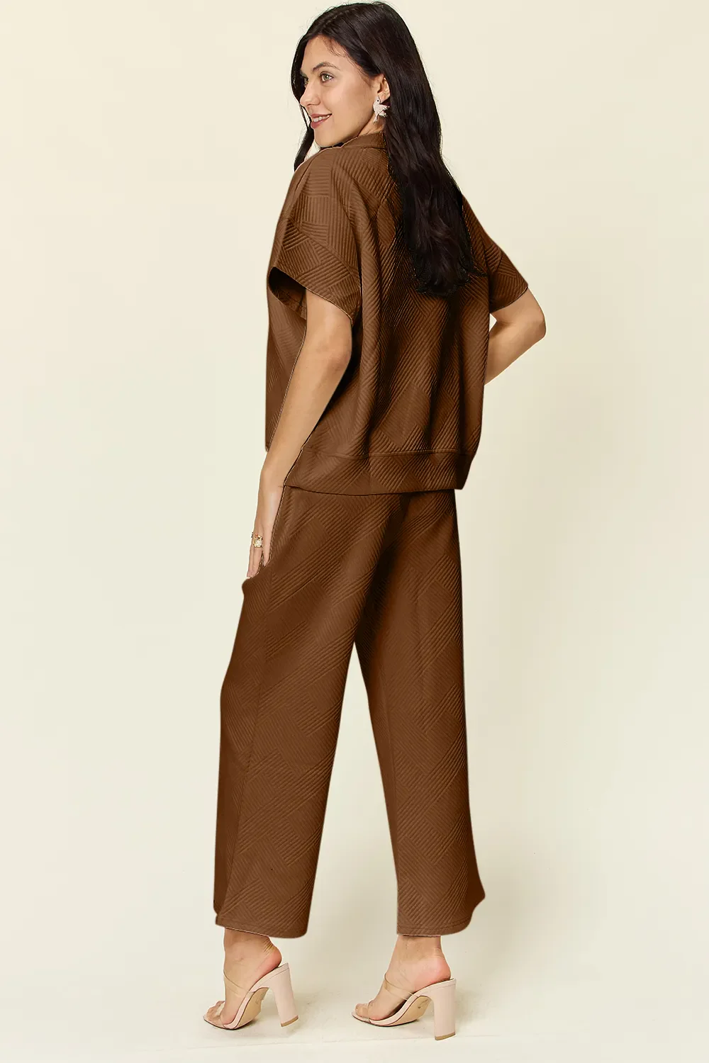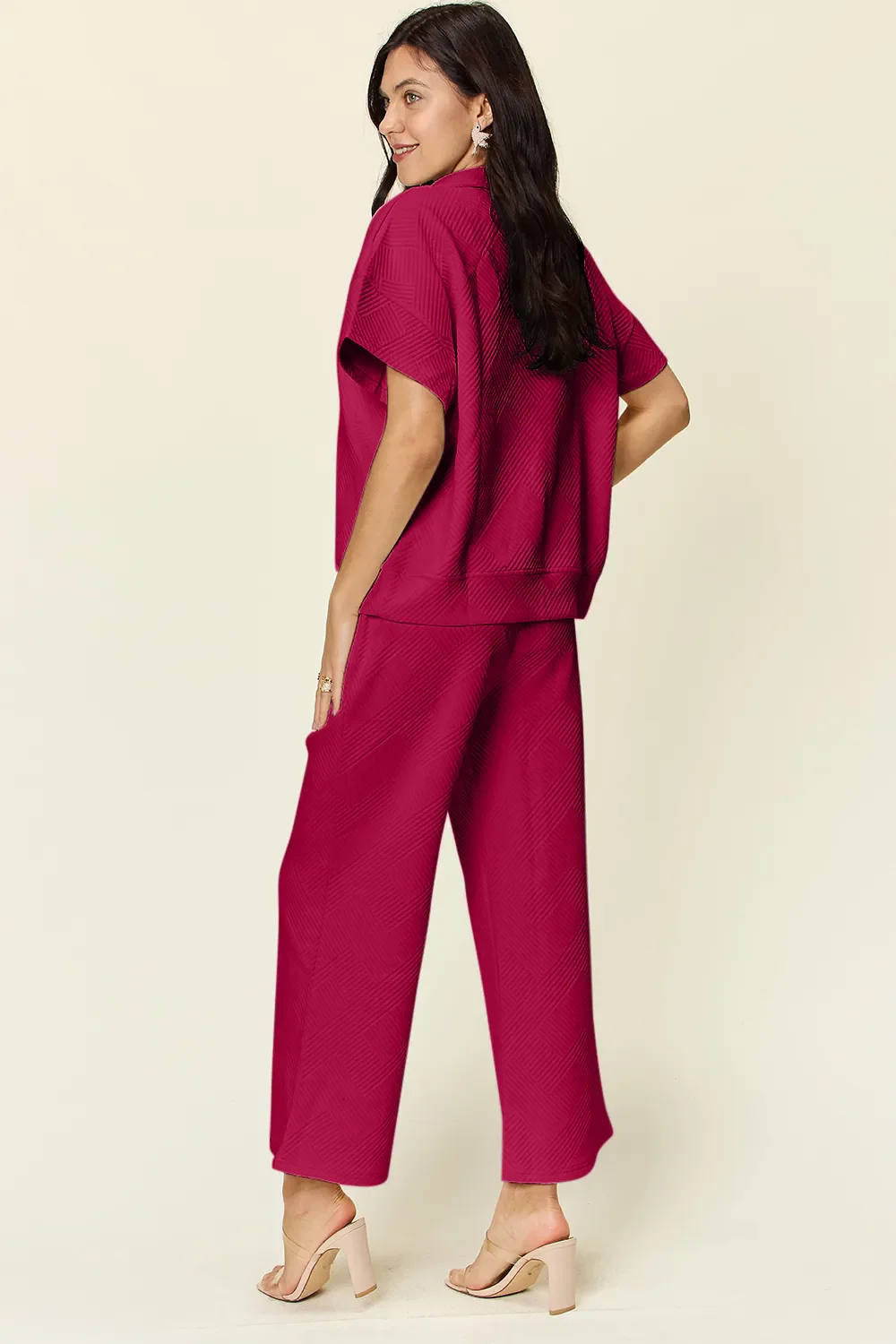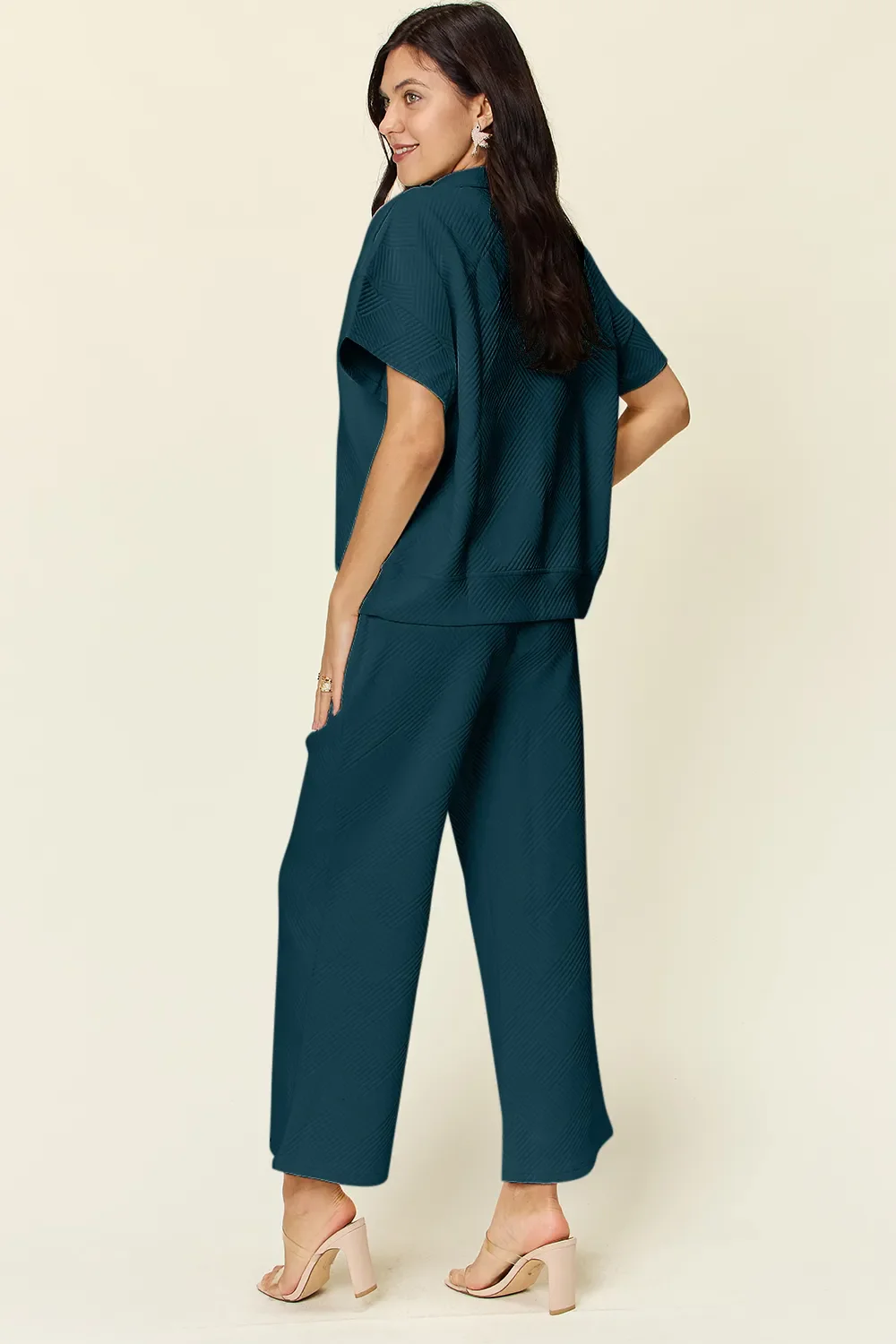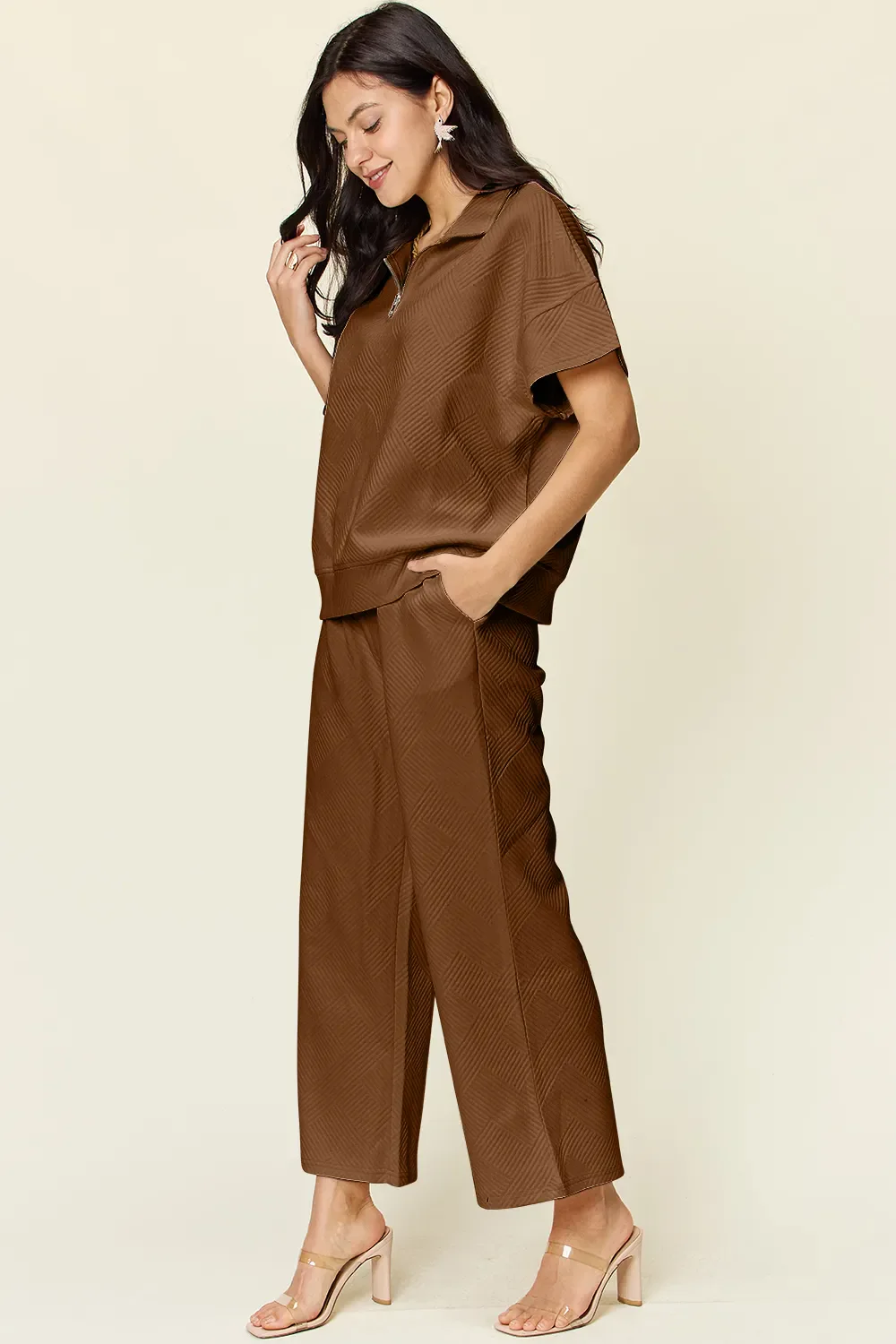 Double Take Full Size Texture Half Zip Short Sleeve Top and Pants Set
